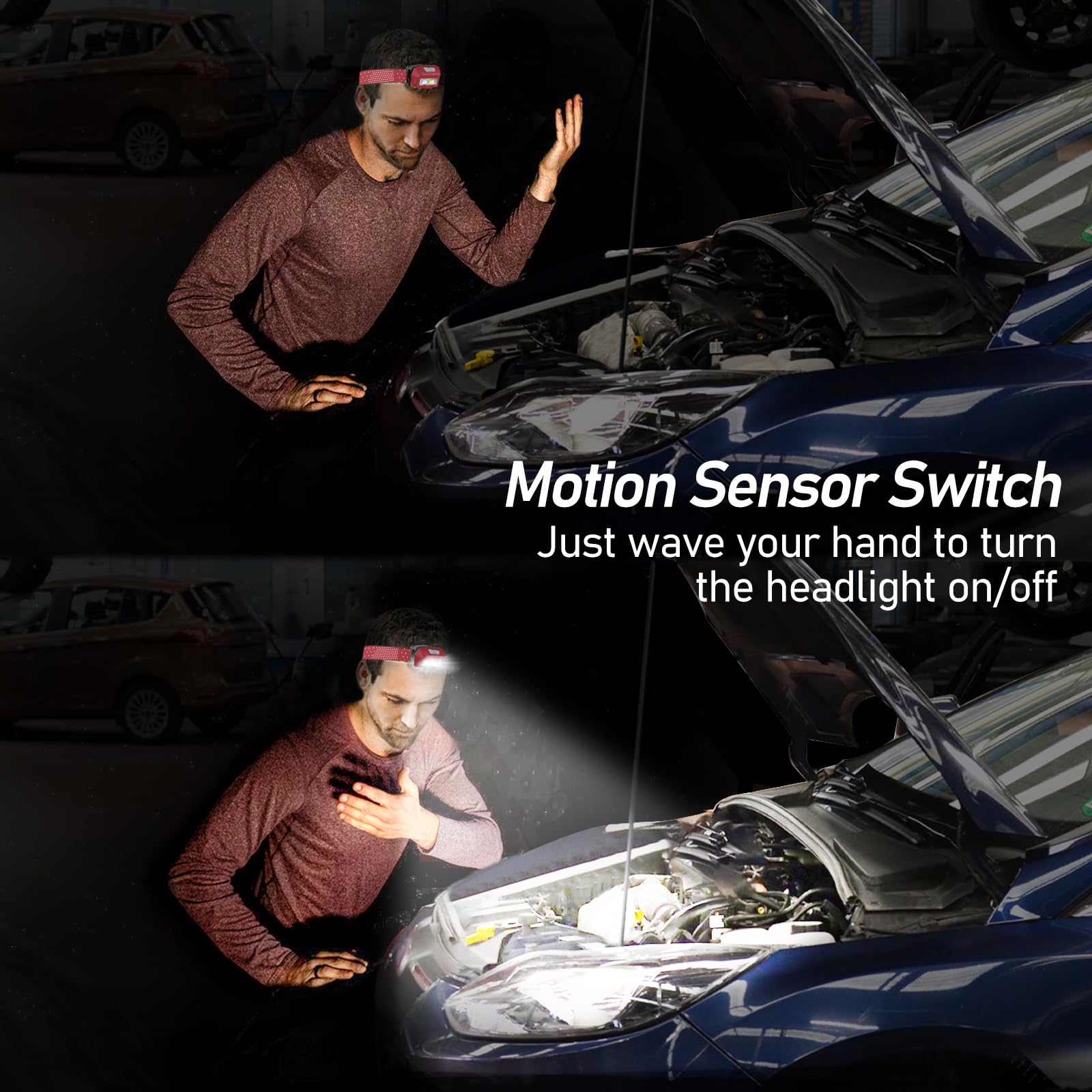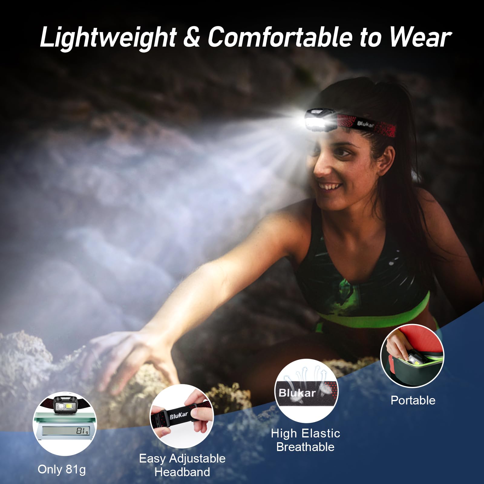 Blukar LED Stirnlampe Wiederaufladbar, Superhell 2000 Lumen Stufenlos Dimmbar Kopflampe mit 8 Lichtmodi, Sensor und Rotlicht, Leichtgewichtig Wasserdichte Mini Stirnlampe für Campen, Angeln usw.