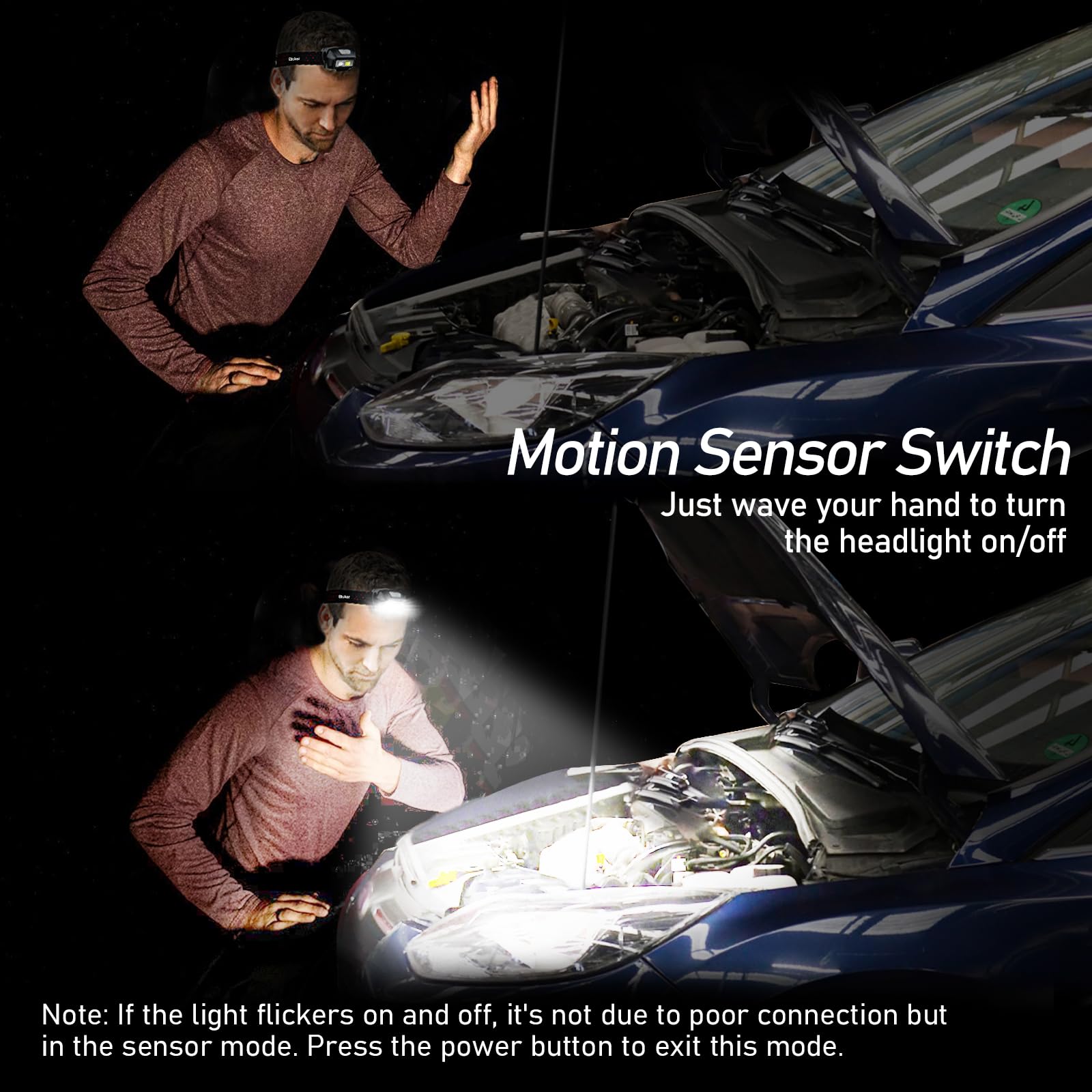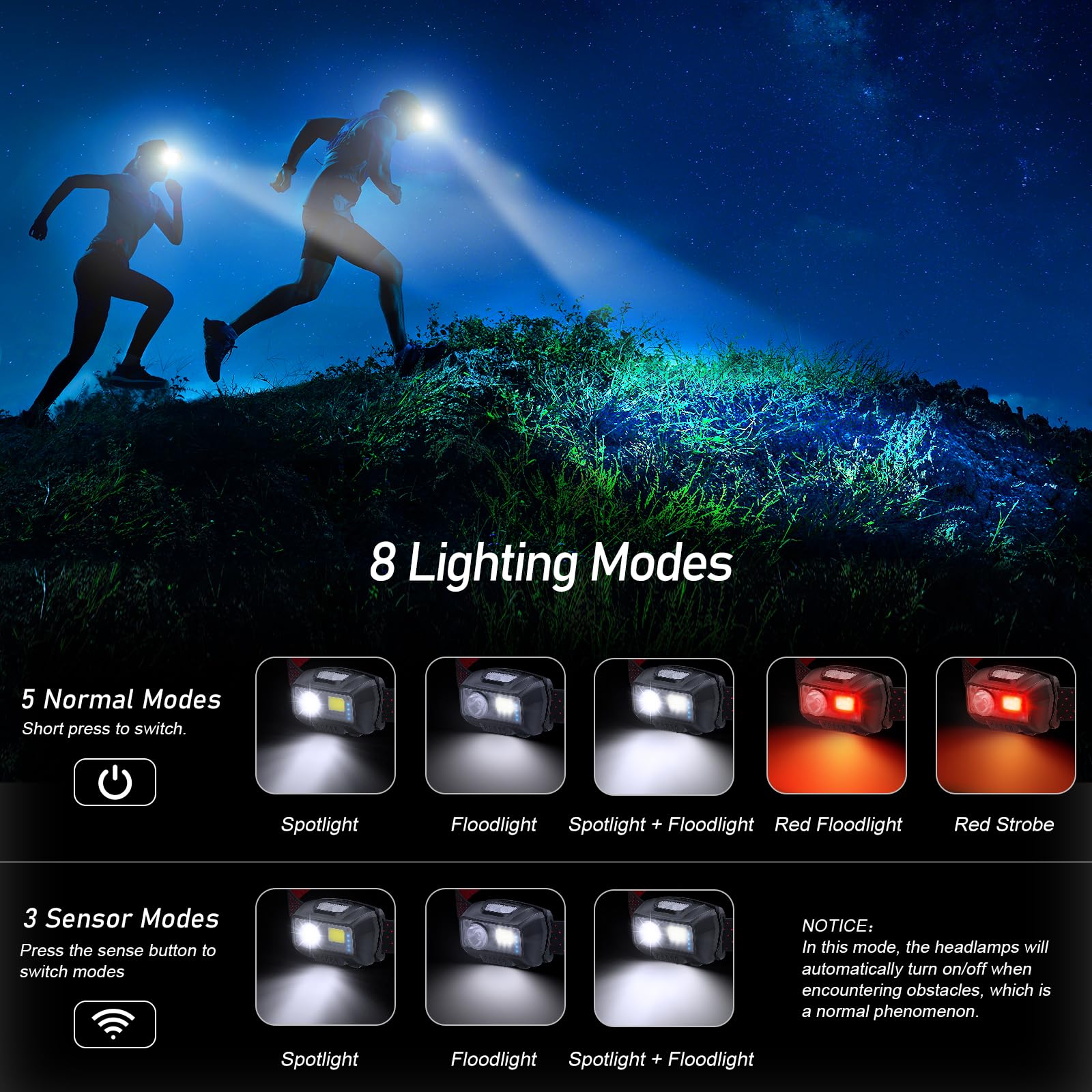 - Stufenlos Dimmbar & 8 Beleuchtungsmodi: Stufenlos dimmbar, um Ihre unterschiedlichen Helligkeitsanforderungen für verschiedene Beleuchtungsszenarien zu erfüllen. Und dank des eingebauten Sensors dieser Stirnlampe erhalten Sie 3 Sensor Beleuchtungsmodi und 5 reguläre Beleuchtungsmodi.