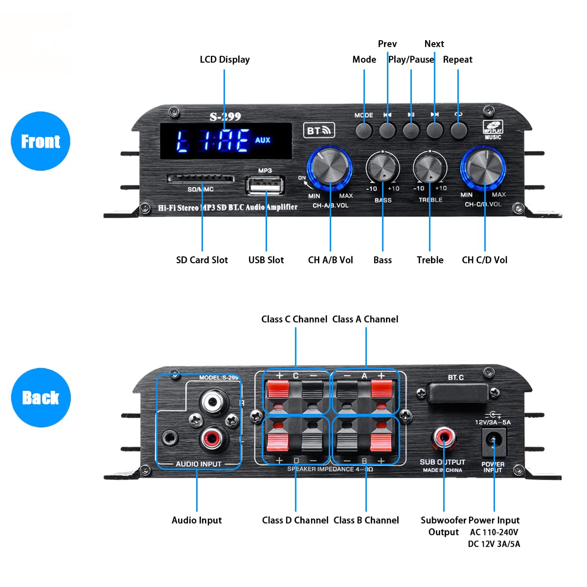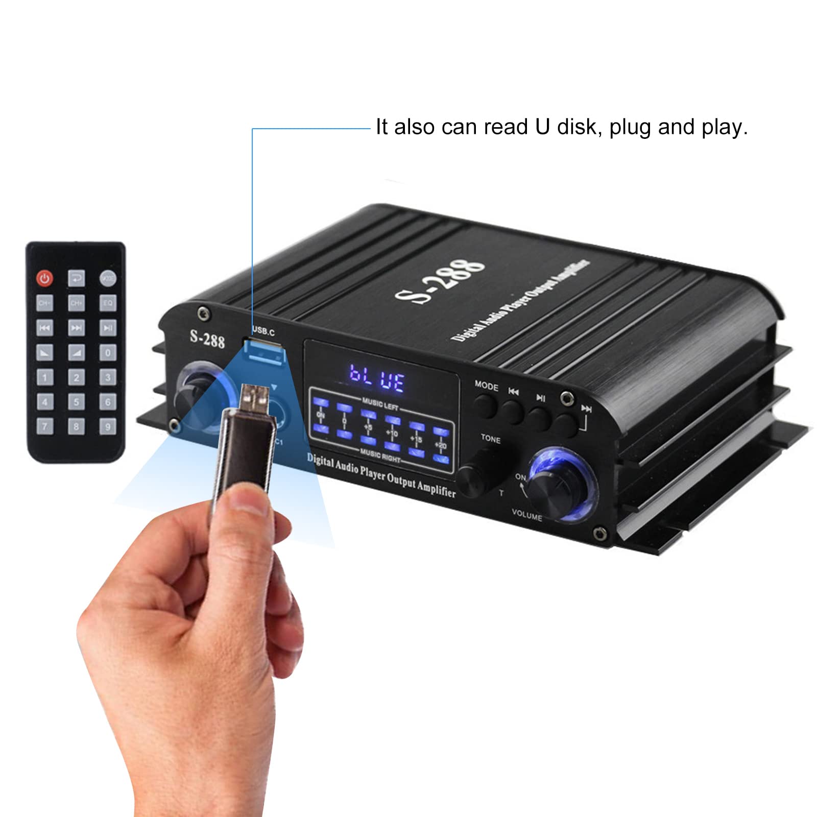 - 【USB/SD-Karteneingang】 Dieser Verstärker verfügt über einen USB/SD-Eingang, mit dem Sie mp3 abspielen oder eine Verbindung zu Ihrem Computer herstellen können. Damit können Sie Ihre Lieblingsmusik abspielen. Es ist so einfach wie das Einlegen einer SD-Karte oder eines USB-Flash-Laufwerks, um Musik direkt abzuspielen.