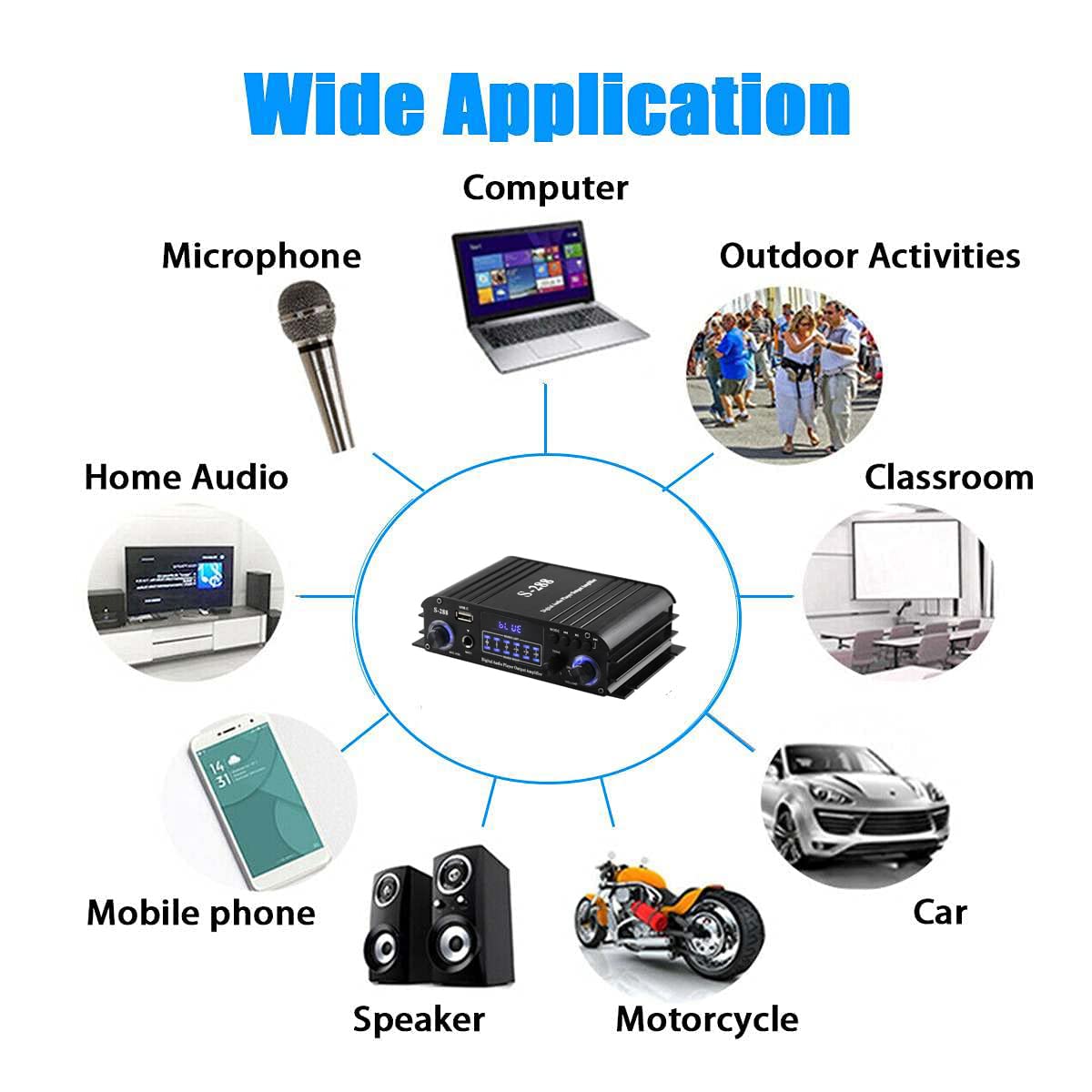- 【Bluetooth 5.0 / Cinch-Eingang】Mini-Verstärker kompatibel mit Bluetooth / Cinch-Eingang, einfach mit Smartphones, Tablets und anderen Bluetooth-Geräten zu verbinden. Es hat auch einen USB-Eingang. Das heißt, streamen Sie Musik, wie Sie möchten, genießen Sie Musik in hoher Qualität, die für Heimaudio, Auto, alle Arten von Partys, Familienfeiern, Tanzkurse, eine Bar, ein Restaurant, einen Nachtclub usw. geeignet ist.